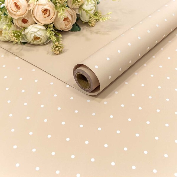 Плёнка флористическая матовая в рулоне 58 см*10 м Мелкий горошек бежево-серый 442520 купить оптом и в розницу предлагает интернет-магазин Радуга 52. Оптовая цена действует при заказе от 3 000 ₽.