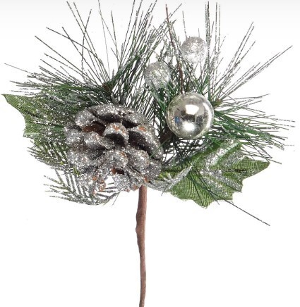 Декоративная новогодняя ветка с шишкой и шариком 20 см Серебряный 50144