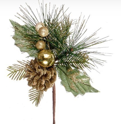 Декоративная новогодняя ветка с шишкой и шариком 20 см Золотой 50143