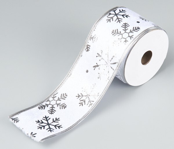 Лента новогодняя декоративная Снежинки 6.3*10 ярд Белый/серебро 50160