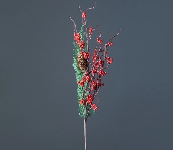 Ветка декоративная с красными ягодами и шишкой 70 см 50116