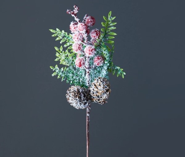 Ветка декоративная заснеженная с красными ягодами, шишками 24 см 50107