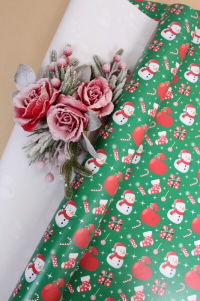 Бумага упаковочная новогодняя глянцевая 70*100 см Снеговик и мешок на зеленом 10 л/уп 568026