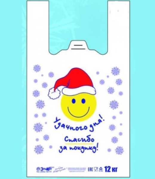 Полиэтиленовый пакет майка ПНД 9 мкм 26+14х48 см Спасибо за покупку-Удачного дня Новогодний 100 шт
