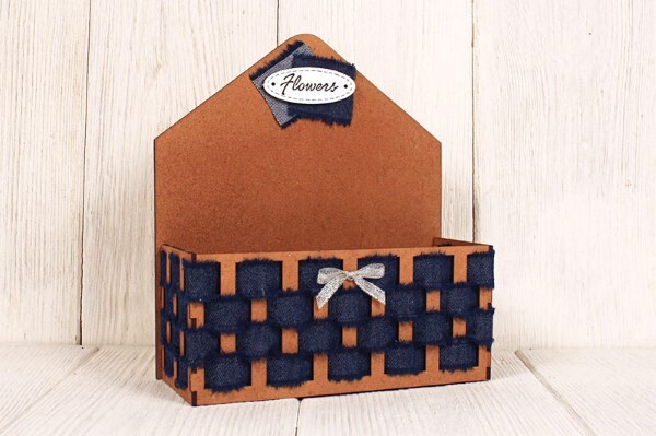 Коробка для цветов оформлена джинсовой тканью 18*6.5*20.5 см 15392