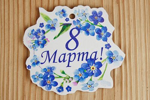 Шильдик деревянный "8 Марта" с синими цветами (7.8*6.7) 15358